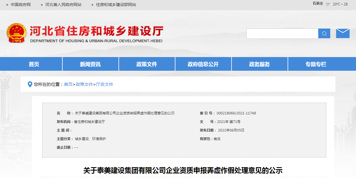 關(guān)于泰美建設(shè)集團有限公司企業(yè)資質(zhì)申報弄虛作假處理意見的公示