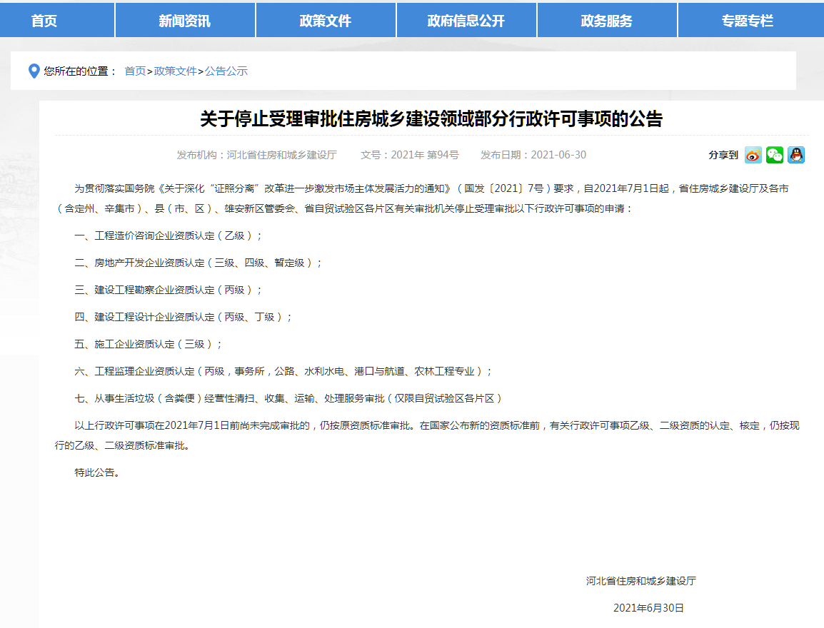 為貫徹落實國務(wù)院《關(guān)于深化“證照分離”改革進一步激發(fā)市場主體發(fā)展活力的通知》(國發(fā)〔2021〕7號)要求,自2021年7月1日起,省住房城鄉(xiāng)建設(shè)廳及各市(含定州、辛集市)、縣(市、區(qū))、雄安新區(qū)管委會、省自貿(mào)試驗區(qū)各片區(qū)有關(guān)審批機關(guān)停止受理審批以下行政許可事項的申請:
